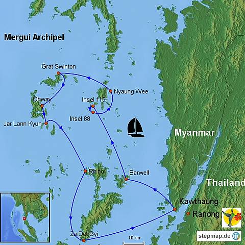 Auf einer klassischen Zweimaster Segelyacht entweder Meta IV oder Raja Laut oder dem Lagoon 500 Katamaran SY Meltemi, erwartet Sie unsere professionelle Mannschaft, die um Ihr Wohl besorgt ist und Ihnen kaum einen Wunsch offenlässt. Die Crew segelt für Sie, bietet Ihnen aber auch die Möglichkeit, selbst Hand mit anzulegen. Entspannen Sie sich an traumhaft schönen menschenleeren Stränden im Mergui Archipel.