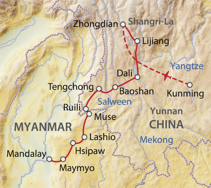 Dali ist Ausgangspunkt zur alten Burma Strasse und liegt am Ufer des idyllischen Erhai Sees. Sie unternehmen einen Rundgang durch die malerische Altstadt, besuchen den Markt, die ehemaligen Stadttore und den gut erhaltenen «3 Pagoden Tempel», bevor die Reise entlang der alten Burma Strasse in Richtung Baoshan weiterführt. Als die vorrückenden japanischen Truppen während des 2. Weltkrieges die amerikanischen Versorgungslinien unterbrachen, liess der amerikanische General Joseph Stillwell die Handelsstrasse von Ledo (Indien) über Burma nach Yunnan in China ausbauen. Kurz vor Baoshan überqueren Sie das Tal des Mekong Flusses.